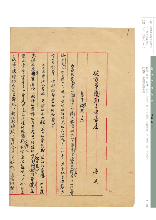 那么,像這樣一份魯迅準備丟棄卻被他人保存下來的手稿究竟應該怎么處理呢?總不能在手稿全集中出現一類“棄稿”吧?話說回來,棄稿也是稿。古代作者文集中有“擬刪稿”“刪余稿”“擬刪草”。這次手稿全集中古籍編,也有一些古代手稿學的名目,如抄稿、草稿、校稿、備校稿,細致的區分讓研究者和讀者易于判別。