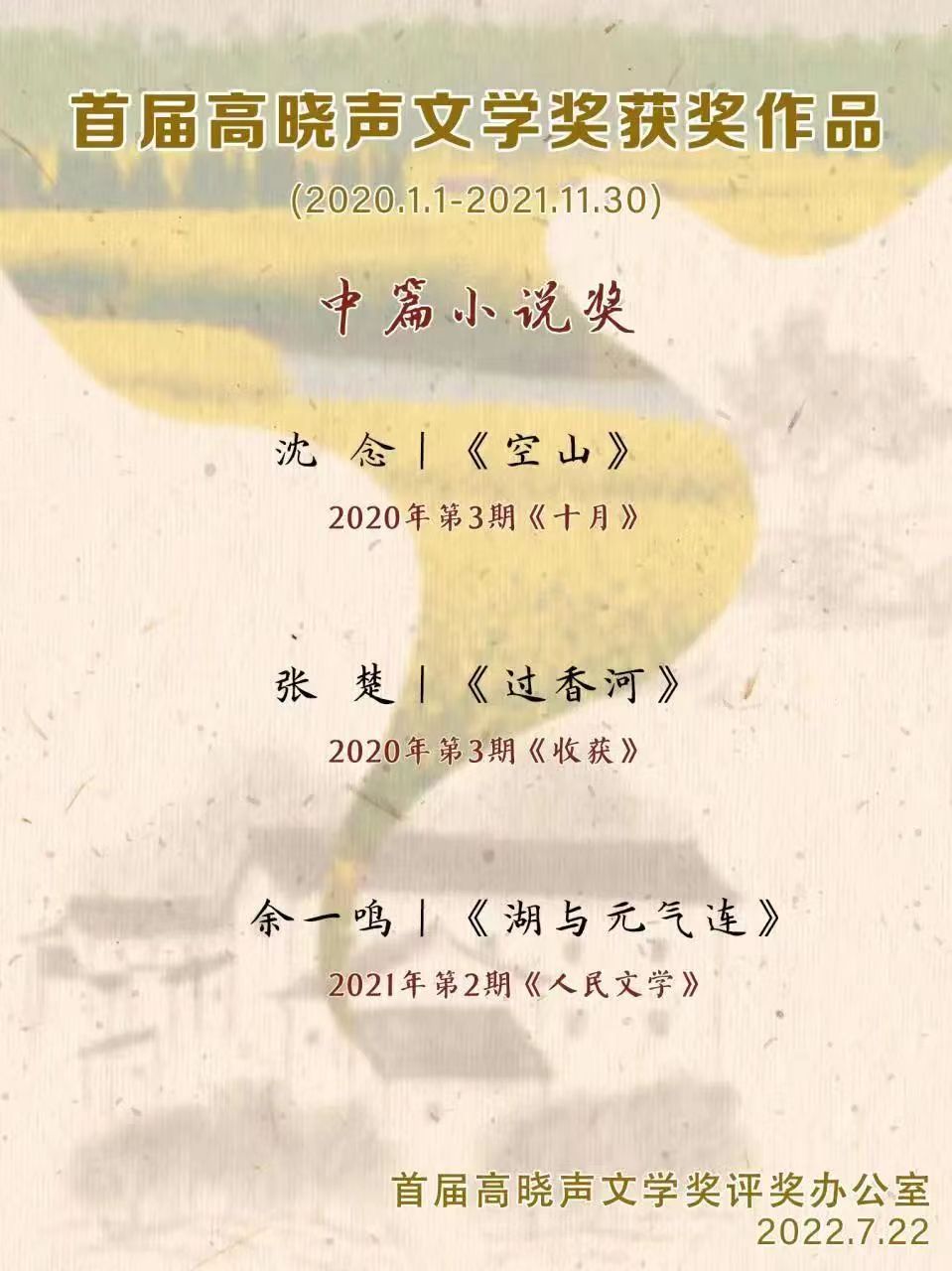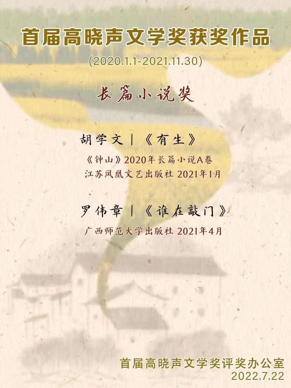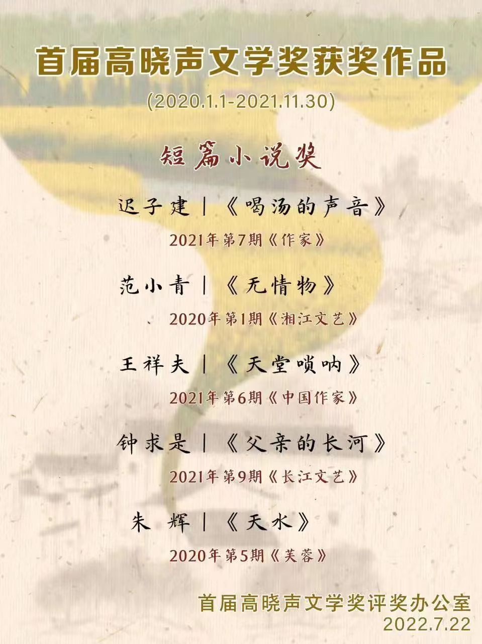 7月22日,首屆高曉聲文學獎在江蘇省常州市揭曉,《有生》《空山》《喝湯的聲音》等10部(篇)作品分獲長篇小說獎、中篇小說獎、短篇小說獎。江蘇省作家協會黨組成員、書記處書記、副主席丁捷,常州市委宣傳部副部長、市新聞出版局(版權局)局長謝春林,常州市文聯黨組書記、主席舒文,南京大學教授王彬彬,江蘇鳳凰文藝出版社原社長黃小初等出席首屆高曉聲文學獎新聞發布會。發布會由常州市委宣傳部四級調研員王志新主持。