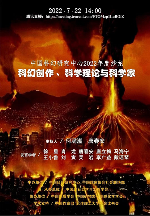 2022年7月22日,中國科幻研究中心2022年度沙龍活動之一“科幻創作、科學理論與科學家”以騰訊會議的方式舉行。此次沙龍活動由中國科幻研究中心、中國作家協會社會聯絡部主辦,中國巖石力學與工程學會承辦,中國地質學會、中國礦物巖石地球化學學會協辦,中國作家網和大連理工大學和光讀書會作為學術支持。