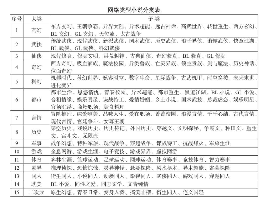 網絡小說究竟有多少類型可謂言人人殊。我的一個學生在做網絡文學調研時,對排名靠前的100家文學網站進行了長達6年的跟蹤調查,發現網絡類型小說多達70類,其中作品數量最多的是12類,原創小說覆蓋行業90%以上。我通過網絡調查和網站搜索,統計收集的相關信息發現,作品最多、最受關注的網絡類型小說主要有15個大類,132個子類,如下表: