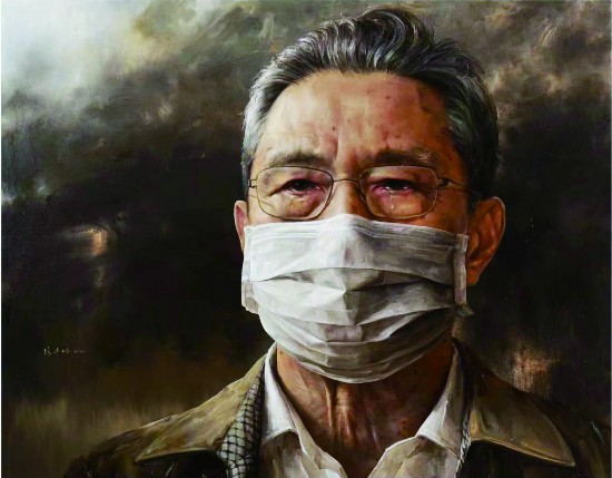 該作品以鐘南山院士正面頭像為主要表現對象,突出其醫生、黨員、院士、老人等身份,畫面中灰白頭發、皺紋、斑點、眼淚、口罩、眼鏡等細節,以及仁心、憐憫、憔悴、堅毅、奉獻等精神符號,都具有特殊時期的典型性、象征性。畫幅巨大,給人以強烈視覺沖擊和震撼。畫家盡情發揮油畫寫實表現力強的特性,對人物面部主要特征進行深入和細致刻畫,使之鮮明逼真、生動傳神、立體飽滿,寫實而不刻板。肖像背景采用寫意性的鋪染,與面部主體寫實具象手法形成對比,人像更突出,陰沉灰暗的風云涌動襯托出形勢氣氛的艱難嚴峻。在色彩處理上,以灰、黑、白、褐、赭、土黃等為主色系,藝術上更豐富、渾厚、深沉。畫家都在有意或自覺地向經典性作品的高要求不斷努力,并達到了滿意的效果。