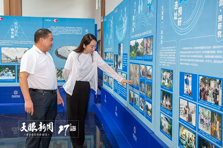 在當天的采訪中,孟學祥走進“中國天眼”基地展覽大廳,參觀了“中國天眼”從無到有的蓬勃發展歷程。每個過程都配以系列展板、模型及視頻等,或以時間串連,或以大事記的形式,闡述“中國天眼”選址、建設、投入運行、取得科技成就。