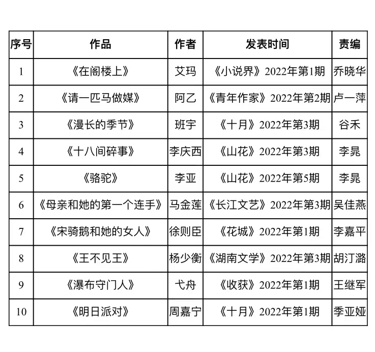 綜合2022年1月至6月每期推薦的所有作品,經評審團再次推選、評議并投票,中國作家網“優選中短篇”半年榜出爐,以下為最終入選的十部作品(排名以作者姓氏拼音為序)。