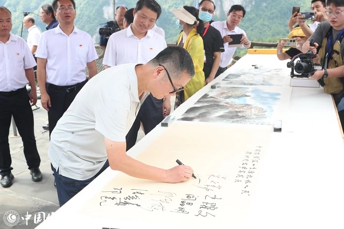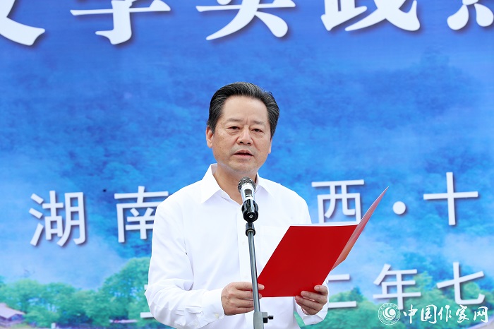 中國作協主席團委員、書記處書記邱華棟為中國作家“深入生活、扎根人民”新時代文學實踐點授牌,湘西州州委書記虢正貴接牌
