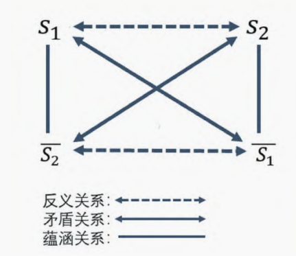 格雷馬斯在列維-斯特勞斯所提出的二元對立結構上增加了兩個語義素,以四個語義素之間的相互關系來構造敘事的深層邏輯,四項語義素之間的彼此作用與動態轉化促使意義生成。這一符號方陣又成為格雷馬斯的“意義矩陣”。如圖1所示。