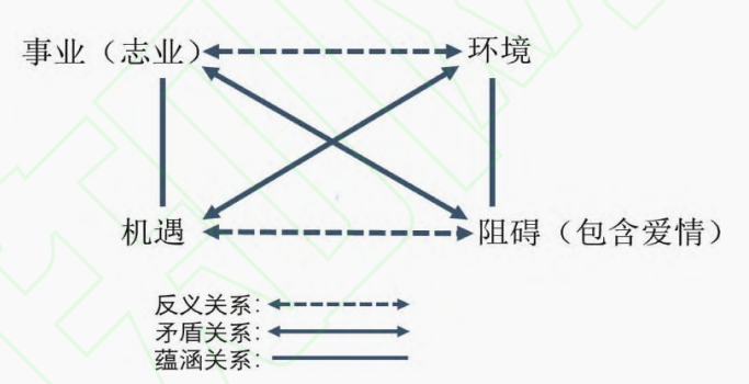 將作品代入圖3這一“意義矩陣”之中進行內容賦值,可以清晰地呈現其深層敘事結構,由此闡釋其閱讀接受中所出現的相應問題。例如沉筱之的古言作品《青云臺》,“事業”是對于洗襟臺坍塌一案的清查,“環境”則由各個階層合力鑄成,密不透風,雖然各方立場不同,但是他們各自注入洗襟臺的私欲都讓真相難以被揭開。舊日工匠、書生、山匪等角色的接連出現衍生出了主人公的追尋軌跡,而言情線“不由自主”地拖累著事業線這一主線的推進。溫小野與小昭王的言情線每一展開,敘述時間便延宕下來。尤其是下卷中,各方勢力的聯合“絞殺”為懸案的加快偵破帶來緊迫性,但言情線上時間流速的舒緩與行動要求的快節奏相矛盾,造成了彼此氛圍“對沖”的效果。所以,雖然溫昭二人的“愛情”并不與“事業”相對立,卻不由得建立了“反義關系”。作者沉筱之為了避免因兩條線索“打架”影響故事的發展,放棄了言情線的繼續,而讀者也紛紛詬病懸疑線的拖沓和言情線的驟然消失。