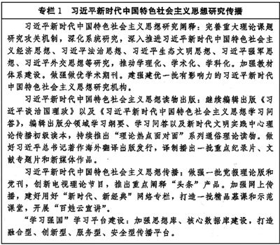 把學習宣傳貫徹習近平新時代中國特色社會主義思想作為長期重大政治任務,完善持續深入學習的常態化長效化機制,健全用黨的創新理論武裝全黨、教育人民的工作體系。編輯出版習近平總書記系列重要著作。加強對習近平新時代中國特色社會主義思想整體性系統性研究、學理性闡釋和學科性建設,加強對實現馬克思主義中國化新的飛躍的重大原創性貢獻的研究闡釋宣傳。持續開展中國特色社會主義和中國夢宣傳教育。完善黨委(黨組)理論學習中心組等各層級學習制度,組織開展列席旁聽和督促檢查。持續開展黨員大規模輪訓。綜合運用全媒體方式、大眾化語言、藝術化形式,結合黨治國理政的生動實踐和歷史性成就,全方位、多層次開展對象化、分眾化、互動化理論宣傳普及。創新高等學校思政課內容和方式,鼓勵文化名家講思政課,打造思政精品課程,推動黨的創新理論進教材、進課堂、進學生頭腦。(見專欄1)