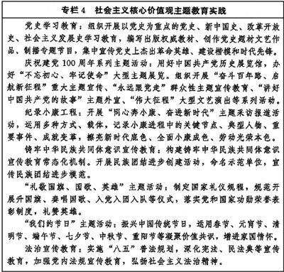 持續深化社會主義核心價值觀宣傳教育,增進認知認同、樹立鮮明導向、強化示范帶動。堅持貫穿結合融入、落細落小落實,把社會主義核心價值觀要求融入日常生活,融入法治建設。推動理想信念教育常態化制度化,筑牢黨員干部、青少年等重點群體的理想信念之基。圍繞“七一”、“八一”、“十一”等重大時間節點,依托革命歷史類紀念設施、遺址和愛國主義教育基地等載體,加強愛國主義、集體主義、社會主義教育,弘揚黨和人民在各個歷史時期奮斗中形成的偉大精神。加強公益廣告宣傳。統籌開展誠信教育、勤儉節約教育、勞動創造幸福主題宣傳教育。強化祖國統一和民族團結進步宣傳教育,深化“一國兩制”實踐教育,強化全民國防教育,促進平安中國建設。(見專欄4)
