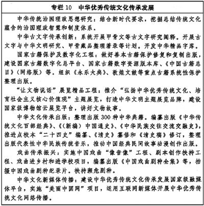 深入研究中華文明、中華文化的起源和特質,構建中國文化基因的理念體系。加強中華民族共同體重大基礎性問題研究,深入研究闡釋中華民族共同體歷史、中華民族多元一體格局。深入實施中華優秀傳統文化傳承發展工程,加強中華文明探源和考古研究成果、中華文化典籍等全媒體傳播,提升博物館、紀念館和文物保護單位展陳教育水平。深入開展革命歷史總體研究和專題研究,加大革命史料和文物調查征集研究力度。弘揚偉大建黨精神,系統梳理闡釋中國共產黨人的精神譜系。扶持民族民間文化整理研究。挖掘、傳承和弘揚中醫藥文化。(見專欄10)(見專欄11)