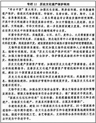 樹牢保護歷史文化遺產責任重大的觀念,增強對歷史文物的敬畏之心。全面加強考古工作,健全“先考古、后出讓”制度。加強文物科技創新。統籌指導各類文物資源普查和名錄公布,編制文物保護單位保護規劃等專項規劃,納入國土空間規劃實施。推進世界文化遺產申報、保護管理和展示宣傳。加強不可移動文物和館藏文物保護修復。加大流失文物追索返還工作力度。推進文物合理利用,建設國家考古遺址公園、文物保護利用示范區、文化遺產廊道,推介以文物資源為載體的國家文化地標和中華文明標識體系。實施中華文物全媒體傳播計劃。健全文物安全長效機制,嚴厲打擊文物犯罪。