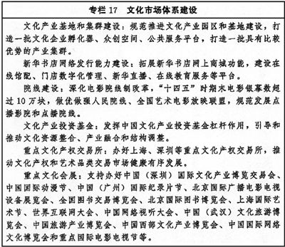 加快構建統一開放、高效規范、競爭有序的文化市場。健全文化市場體系基礎制度,完善文化企業堅持正確導向履行社會責任制度。落實統一的市場準入負面清單制度,清理破除文化市場準入隱性壁壘。健全文化要素市場運行機制,促進勞動力、資本、技術、數據等合理流動。加快推進符合文化產業發展需求和文化企業特點的金融產品與服務創新。進一步擴大文化企業股權融資和債券融資規模,支持文化企業上市融資和再融資。探索文化金融服務中心模式,為文化企業提供綜合性金融服務。全面促進文化消費,加快發展新型文化消費模式,發展夜間經濟。加強文化市場信用體系建設,提升文化市場服務質量,強化文化市場管理和綜合執法。(見專欄17)