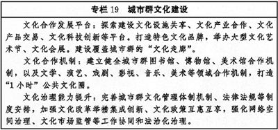 加強區域文化協同創新,健全合作互助、扶持補償機制,推動東部地區以創新引領文化發展,加大力度支持中西部地區以及東北等老工業基地文化發展,扶持革命老區、民族地區、邊疆地區文化發展,形成相互促進、優勢互補、融合互動的區域文化發展格局。圍繞京津冀協同發展、長江經濟帶發展、粵港澳大灣區建設、長三角一體化發展、黃河流域生態保護和高質量發展等區域重大戰略,健全推進區域內文化協同發展機制,提升公共文化設施互聯互通水平,加強區域文化產業帶建設,實現區域文化建設水平整體提高。促進形成文化產業發展新格局,創新城市群文化一體化發展體制機制,共建高水平合作平臺,加強公共文化服務便利共享。完善以城帶鄉、城鄉融合的文化發展體制機制,發揮城市帶動輻射作用,加快城鄉間文化要素雙向流動,形成以點帶面、特色鮮明、優勢互補、均衡配置的城鄉文化發展新格局。(見專欄19)