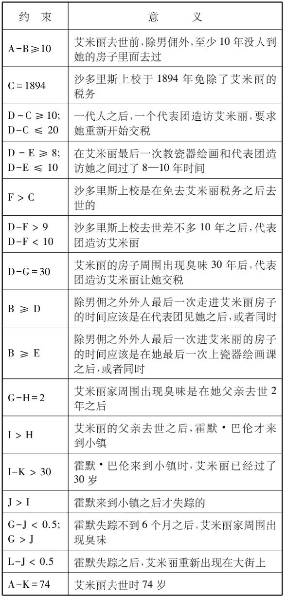 在此基礎上,她們決定采用約束編程方法給《玫瑰》編輯一個程序?!睹倒濉分械氖录蠖嘀挥幸恍┠:南鄬r間信息,新的電腦程序通過對這些信息加以整理,給所有變量附加一些約束,將最大限度地整理出不同變量之間的準確時間關系。例如,由于艾米麗獲得稅務豁免的時間是1894年,所以可以用C=1894來表示,同樣,由于艾米麗死前的10年當中除了黑人男傭之外誰也沒有進過她家的房子,所以可以用A-B≥10來表示。通過這樣的等式和不等式,我們就可以得出一個新的表格: