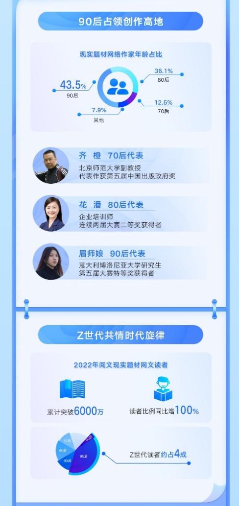 《報告》顯示,現實題材年輕化趨勢顯著。90后創作者成長為中堅力量,占比達43.5%,本屆大賽優勝獎獲得者“時不識路”(1992年)、第五屆大賽特等獎獲得者“眉師娘”(1998年)等是其中的佼佼者。與創作隊伍的年輕化相呼應,在累計6000萬名讀者中,Z世代占比約4成。
