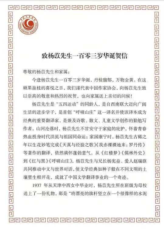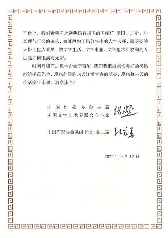 2022年9月12日,是我國著名翻譯家、作家楊苡先生的103歲華誕。中國作協主席、中國文聯主席鐵凝和中國作協黨組書記、副主席張宏森親筆簽名致信,向她致以崇高的敬意和熱烈的祝賀,并向其家屬送上親切的問候。