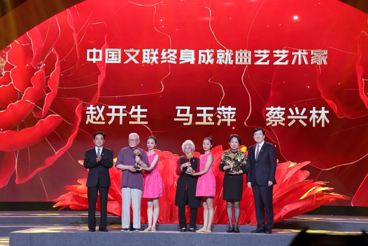 鞏漢林、金珠為第十二屆中國曲藝牡丹獎節目獎、文學獎獲獎者頒獎。