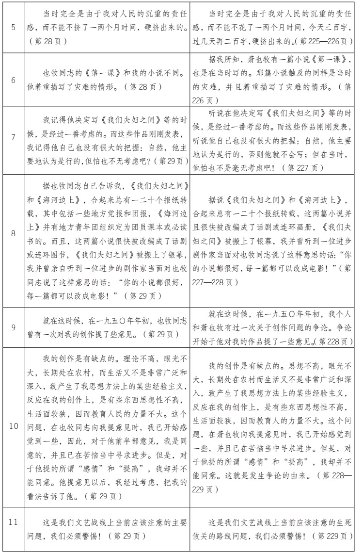 編號4、5和6這三條的修改,可以結合起來進行分析。1951年初刊時,康濯回憶在1940年代初期進行文學創作的過程中他和蕭也牧進行創作的艱辛與工作壓力,至少在工作的態度上,康濯認為蕭也牧是值得認可的。但到1959年初版時,康濯把蕭也牧排除在這種艱辛的工作陳述之外,蕭也牧成為他敘述的“局外人”,那樣的工作環境和寫作環境,反而變成了康濯的“專利”。這在某種程度上遮蔽了蕭也牧曾經的工作態度和寫作態度,從而有效地進行了政治剝離,進而適應1959年的政治批判。
