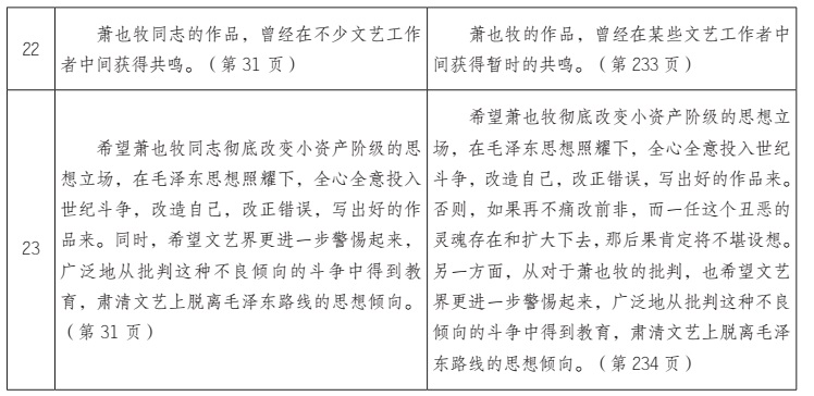 編號23的修改,屬于增加內容。這種增加內容的方式,使得行文的論述得到進一步加強??靛谖恼陆Y尾處,表達了對蕭也牧的真誠期待,切合了1951年全國文藝界開展對蕭也牧文藝創作批判的政治目的:“治病救人?!钡?,在1959年初版時,康濯把蕭也牧內心深處最壞的打算帶來的后果表達了出來,認為蕭也牧“如果再不痛改前非,而一任這個丑惡的靈魂存在和擴大下去,那后果肯定將不堪設想”。也就是說,蕭也牧抵抗文藝界批判他的思想如果存在,這證明蕭也牧有一個“丑惡的靈魂”。按照后來蕭也牧的定性,這證明蕭也牧內心深處有一個“丑惡的靈魂”存在,他成為反黨反社會主義的階級敵人,是右派分子中最壞的右派分子。這種文字修改,明顯是一種政治恫嚇語氣的具體體現,此語氣是當時大多數批判文章都具備的、特殊的時代屬性。