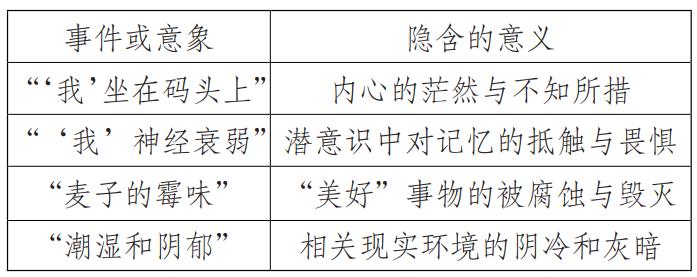其次,是故事的反復能力與敘事的反復能力之間的關系,也就是熱奈特所謂敘事上的“頻率”問題。在一部敘事作品中,經常會發生這樣的現象,故事時間中,發生了n次的事情,或出現了n次的意象,在敘事時間中,卻只敘述了一次。與此相反的情況是,故事時間中一件事情雖然只發生了一次,或同一個意象,在敘事時間中卻被多次提及。當某一事件按照一定的規律在作品中反復出現時,無形中就為小說的敘事賦予了一種和諧而穩定的音樂節奏,我們可以稱之為音樂的主導動機,實際上,也就構成了一種“頻率”。它們通?;蛘弑憩F為一些簡短的語言表達,或者是具有象征意義的意象,在作品中被有意地重復著,而每次的出現都能夠被讀者很快地辨認出來,并引發聯想?!睹裰{》中,就有很多同一事件或意象反復出現的現象,比如,“王大頭在碼頭上坐著”“‘我’神經衰弱”“麥子的霉味”“潮濕和陰郁”等,所有這些都是在小說中曾經多次出現的描述。如果對以上這些事件或意象進行如下分析。