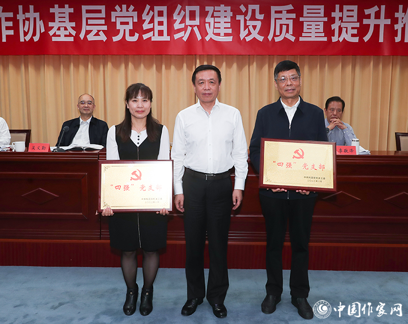 會議為獲得中央和國家機關“四強”黨支部稱號的中國作協辦公廳黨支部、作家出版社有限公司第二黨支部頒授獎牌,為獲得全國“人民滿意的公務員”的外聯部王婉同志頒授證書、獎章。中國作協辦公廳黨支部書記李一鳴、作家出版社有限公司第二黨支部書記王麗勇、魯迅文學院黨支部書記徐可、民族文學雜志社黨支部書記石一寧等4位同志作了交流發言。