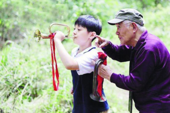 首先,影片建構了一個歷史與現實相互鏈接,祖輩與孫輩思想、情感傳承并相互認同的獨特敘事空間和人物關系鏈條。導演選取這樣獨特的視角和題材,緊扣當下城市孩子普遍缺乏體力、意志力鍛煉,并且較為任性、以自我為中心、缺乏集體協作感等現實問題,通過寓教于樂的方式使孩子們自然而然接受紅色革命歷史教育、傳承紅色基因。我們看到,影片為觀眾建構了爺爺和孫子這一對特殊的人物關系,這種關系與紅色基因的傳承同聲相應,也在當下主場景影像敘事中植入了歷史閃回的景觀敘事。由表演藝術家牛犇飾演的爺爺鄭紅兵,長期堅持居住在山中老屋,他珍藏著那把父親傳承下來的老軍號,并向人們不斷講述過往的革命歷史,他對于老屋和老軍號的堅守不乏象征意義。孫子與爺爺圍繞軍號展開故事沖突,孫子對于老軍號由不理解到理解,也是對爺爺由不理解到理解的思想、情感蛻變過程。