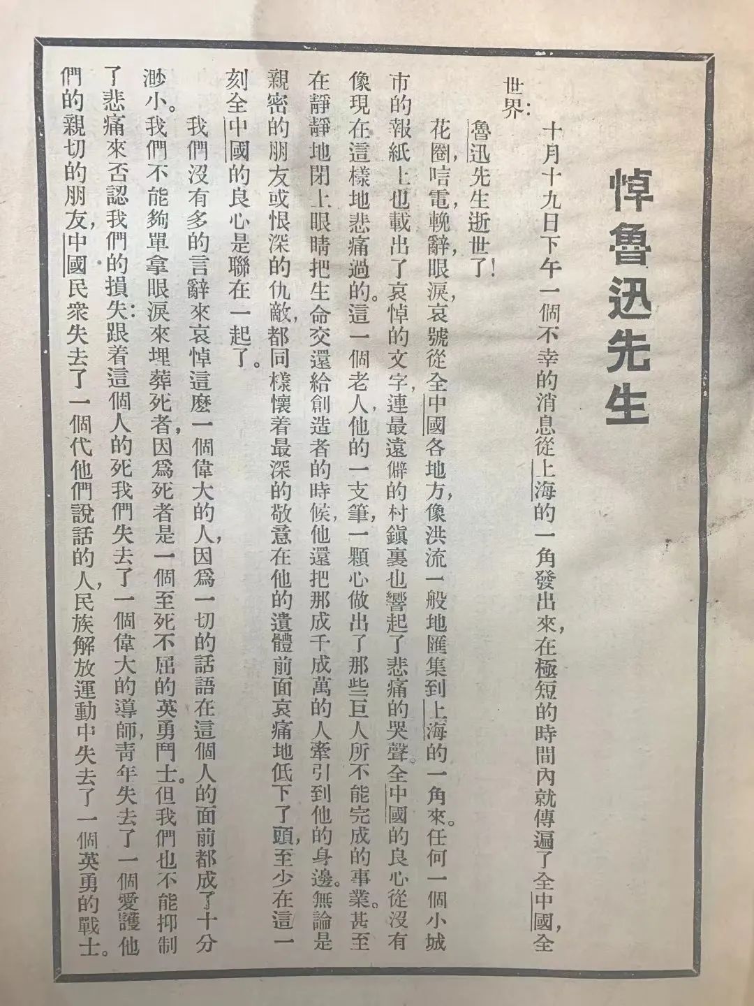 我們沒有多的言辭來哀悼這么一位偉大的人,因為一切的語言在這個老人的面前都變成了十分渺??;我們不能單單用眼淚來埋葬死者,因為死者是一個至死不屈的英勇戰士。但是我們也無法制止悲痛來否認我們的巨大損失;這個老人的逝世使我們失去了一位偉大的導師,青年失去了一個愛護他們的知己朋友,中國人民失去了一個代他們說話的人,中華民族解放運動失去了一個英勇的戰士。這個缺額是無法填補的。(巴金:《悼魯迅先生》)