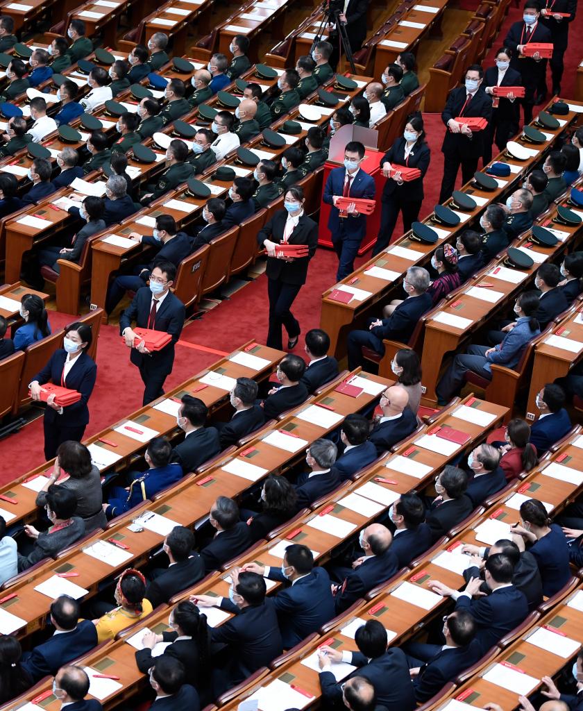 10月22日,中國共產黨第二十次全國代表大會閉幕會在北京人民大會堂舉行。這是工作人員在發選票。 新華社記者 翟健嵐 攝