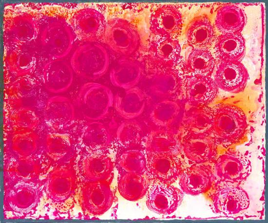 在2018年最初的圓點系列,我在材料的使用上借鑒了版畫的制作原理,不同色層碰撞疊加。在我的畫面中,實心的點和空心的圓都不是標準的、規則的,它們不具有同一性,而是具有書寫的隨機性,它們有集體的共性又有各自隨機生成的個性。我預設了一部分,這是可控的,另外一部分,顏料與媒介在畫布上相遇,它們產生一種化合與反應,一種不可控的偶然。就像一個孩子,你為他設計了成長路線,但各種因素促成了他最終的走向。