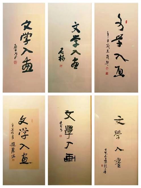 此次展覽沒有開幕式,也沒有閉幕式,展出六人作品60件,每位作者都書寫了“文學入畫”四個字,體現了展覽的特色。