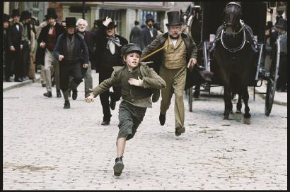 在狄更斯的時代,劇院可以擅自改編期刊上刊發的作品并將其搬上舞臺,若是作品尚在連載中,劇院就會自己加上一個結尾。狄更斯非常痛恨這種做法卻又無計可施。有一次在劇院看到別人演出自己的《霧都孤兒》(那時此小說尚在連載中),狄更斯在包廂角落就地躺倒以示抗議,直至落幕。 圖為改編自狄更斯同名小說的電影《霧都孤兒》劇照