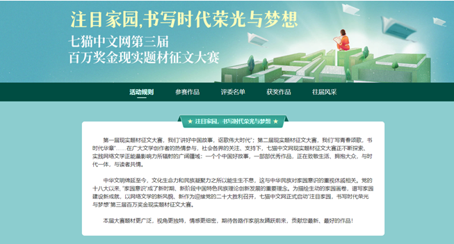 作為專注于原創文學培育與開發的內容平臺,七貓在日前獲得“上海文化企業十強”榮譽。自成立以來,七貓堅持“鼓勵百花齊放,走精品路線”的內容戰略,持續加大對現實題材作品的扶持力度,版權衍生開發作品走向更多讀者,鼓勵創作者著力現實,做時代的記錄者和文化的創新者。2022年6月30日,七貓中文網第三屆現實題材征文大賽已經啟動,以“注目家園,書寫時代榮光與夢想”為主題,目前正在持續收稿中,以期挖掘更多描繪生動的家園畫卷、譜寫家園建設新成就的中國好故事。