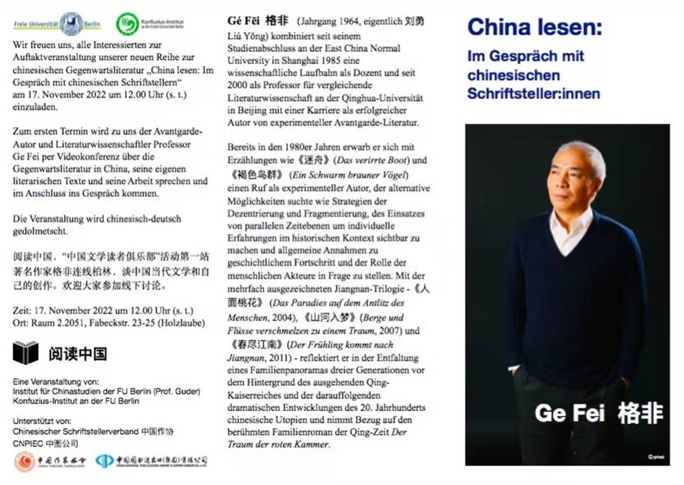 近日,由中國作家協會主辦,中國圖書進出口(集團)有限公司承辦,柏林自由大學孔子學院協辦的德國“中國文學讀者俱樂部”活動——“中國的當代文學”讀者交流會以線上線下結合的方式在德國柏林舉辦。中國當代著名作家、中國作家協會副主席格非作為主要嘉賓,與來自德國柏林自由大學孔子學院、漢學系的師生,以及柏林當地中國文學愛好者等30多人在線交流。