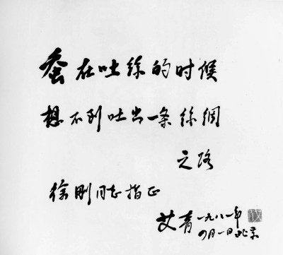 當其時也,艾青進入了一個新的創作高峰期,每有新作,我和楊兆祥,還有周明,總是先睹為快者。長詩如《光的贊歌》等,給《人民文學》,他們有版面;短詩則歸《人民日報》的《大地》副刊。除了索稿,更多的時候是聊天。我們在艾青家或是附近的館子吃飯,艾青牙齒不好,他愛吃“燉得爛爛的肉”。其間,艾青又搬往北緯飯店暫住,離我寄居的華仁路31號只一箭之遙。那時,《光明日報》《詩刊》的社址均在附近,艾青的住處便成了一眾詩人的聚集地,那是詩的聚集、語言的聚集、激情的聚集。這樣的聚集又是如此純凈:只是為了看望艾青,只是因為對詩的熱愛。那熱烈的話語聲,是“純金的三輪馬車,在生活的曠野上馳騁”的聲音。