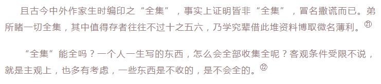 當你說我在為某某編全集時,別以為你是某某的功臣;其實不對,你只是以某某為對象在從事學術工作。只有在特殊年代,因政治或經濟等因素,編纂及出版全集意義重大但舉步維艱(如1938年版《魯迅全集》),那才算崇高的事業。一般情況下,這只是一種日常的學術工作——近年更因得到國家社科基金資助,而成為眾人爭搶的香餑餑。