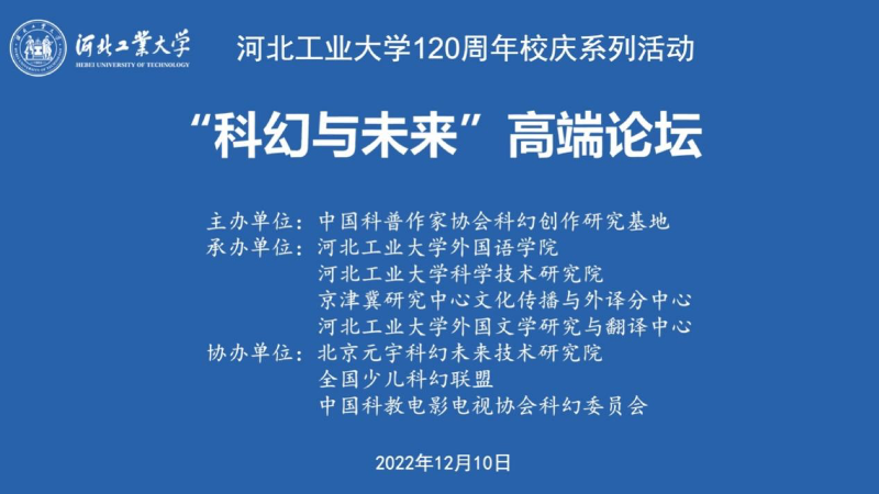 為繁榮科幻創作、發展科幻事業、激發全民族創新創造活力、提升全民科學素質,同時促進科學技術普及和科幻事業與產業發展,為支撐服務經濟社會發展服務,12月10日下午,河北工業大學120周年校慶系列活動“科幻與未來”高端論壇以線上會議的形式成功舉辦。論壇邀請科幻創作與科幻產業研究領域的十余位作家、學者就“科幻與未來”這一主題展開探討,共同暢談科幻發展。