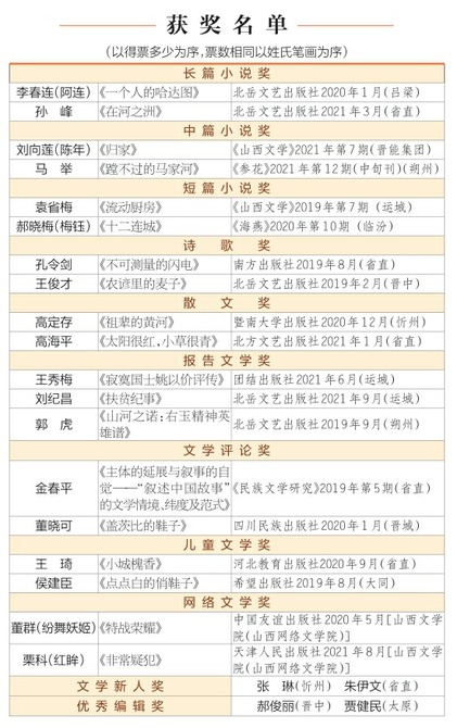 “趙樹理文學獎”是山西省最高榮譽的文學獎項,每三年評選一次,今年評選2019—2021年度“趙樹理文學獎”。12月13日召開了終評評審會,評選出11類獎項,19部(篇)獲獎作品,4位獲獎者。其中,長篇小說獎2部、中篇小說獎2篇、短篇小說獎2篇、詩歌獎2部、散文獎2部、報告文學獎3部、文學評論獎2部(篇)、兒童文學獎2部、網絡文學獎2部。文學新人獎2人,優秀編輯獎2人。