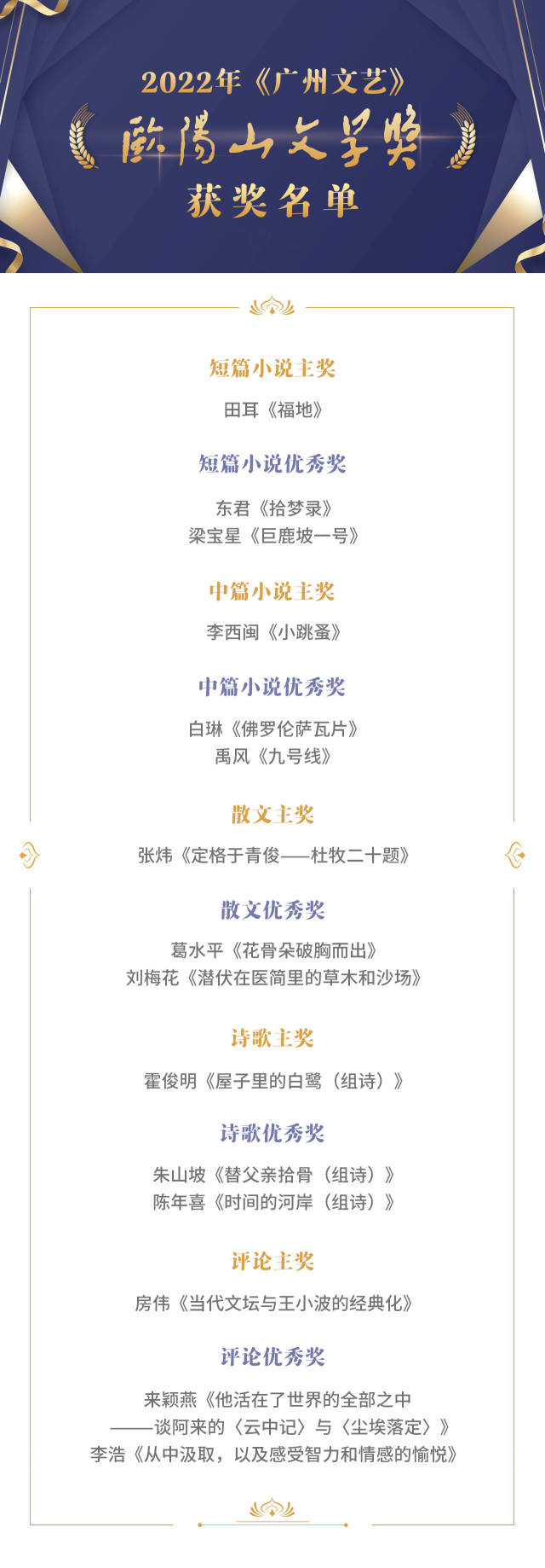 據介紹,首屆歐陽山文學獎評獎范圍為自2020年第一期至2021年第十二期在《廣州文藝》發表的作品,此后每年一屆,旨在推出精品、鑄造廣州文學獎項。歐陽山文學獎分短篇小說、中篇小說、詩歌、散文、評論五大門類評獎,每個門類各設一個主獎、兩個優秀獎。