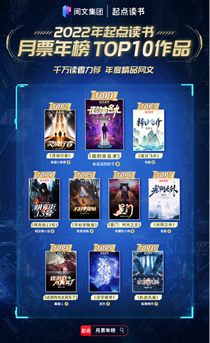 1月3日,閱文旗下的起點讀書公布2022年月票年榜前十,《夜的命名術》以225W+票穩居榜首,打破起點單月月票紀錄,成為起點全站首部單月百萬票作品?!稉袢诊w升》《靈境行者》《不科學御獸》等熱門作品均在榜。
