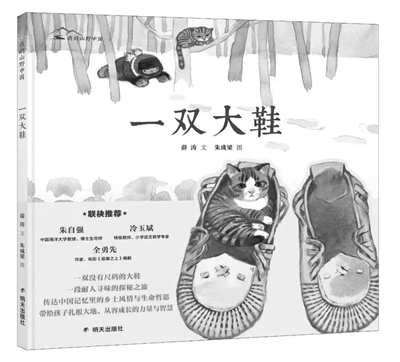 這是兒童文學作家薛濤與畫家朱成梁新近創作的圖畫書《一雙大鞋》的結尾。天空地白,雪道延展,兩聲“再見”里,是一段遙遠的童年;兩聲“再見”里,有一份對故鄉的懷念之情。