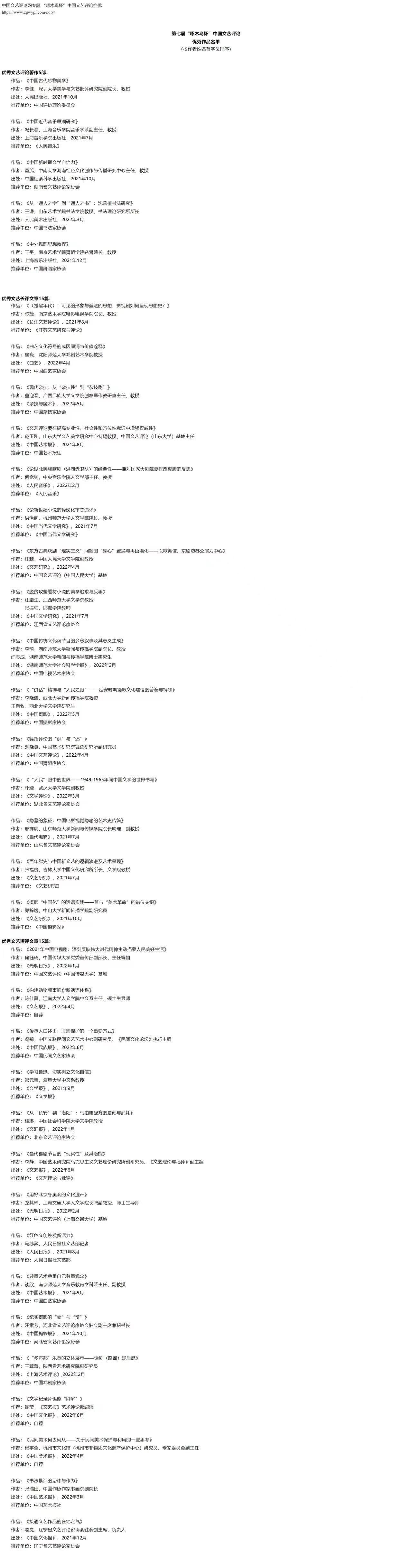 本屆推優活動作品經過推薦單位按名額推薦和中評協會員自薦,共收到作品705份,其中著作76部、長評442篇、短評187篇。推優秉承堅持導向、注重質量、寧缺毋濫的原則,經過初評、復評、終評,并報中國文聯批準,最終推選出李健《中國古代感物美學》、馮長春《中國近代音樂思潮研究》、聶茂《中國新時期文學自信力》等優秀文藝評論著作5部,陳捷《<覺醒年代>:可見的形象與返魅的思想,影視劇如何呈現思想史?》、崔曉《曲藝文化符號的成因厘清與價值詮釋》、董迎春《現代雜技:從“雜技性”到“雜技劇”》等優秀文藝長評文章15篇,許瑩《文學紀錄片也能“刷屏”》、李靜《當代喜劇節目的“現實性”及其潛能》、陳佳冀《構建動物敘事的嶄新話語體系》等優秀文藝短評文章15篇?!白哪绝B杯”中國文藝評論年度推優活動涵蓋文學、戲劇、電影、電視、音樂、舞蹈、美術、攝影、書法、曲藝、雜技、民間文藝以及藝術學理論等領域,旨在推出優秀文藝評論作品,激勵文藝評論工作者,推進全國文藝評論創新和繁榮,促進文藝事業健康發展。推優活動每年舉辦一次,2016年至2021年已成功舉辦六屆。