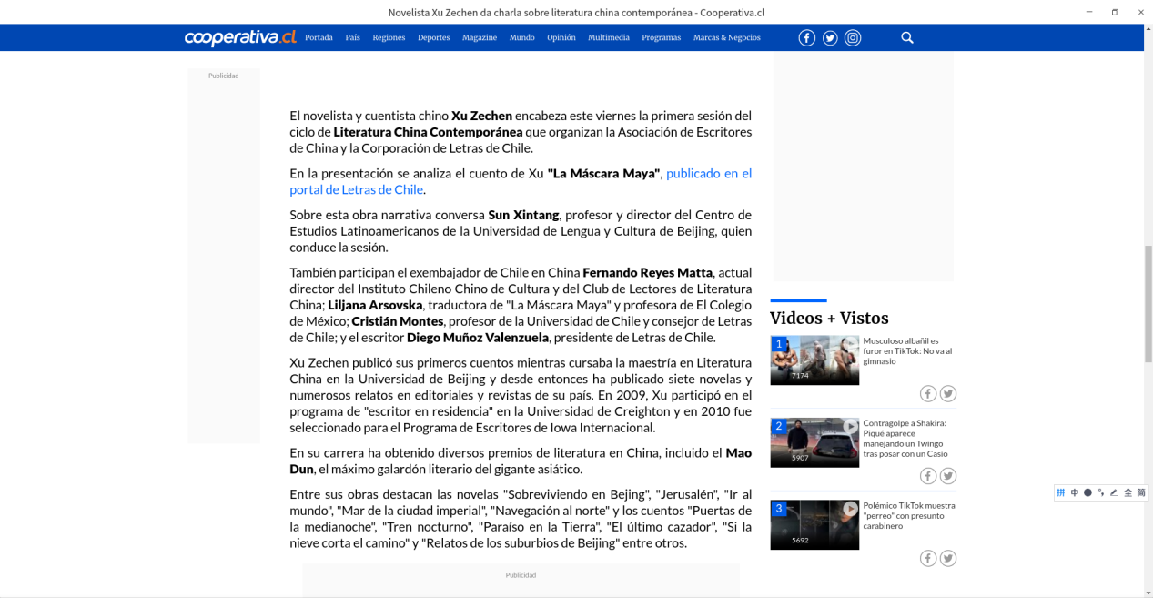 智利時間2023年1月13日,由智利“中國文學讀者俱樂部”與智利文學協會聯合舉辦的徐則臣新作《瑪雅人面具》西班牙文版分享會以線上形式舉辦。徐則臣在線參加,智利前駐華大使、智利中國文學讀者俱樂部主任、安德烈斯貝略大學中國研究中心主任費爾南多?雷耶斯?馬塔教授,智利著名作家、智利文學協會主席迭戈?穆尼奧斯·瓦倫蘇埃拉,翻譯家莉亞娜·阿索夫斯卡教授,評論家、智利大學文學系克里斯蒂安·蒙特斯教授出席分享會并做評論,北京語言大學拉丁美洲研究中心主任孫新堂主持活動。