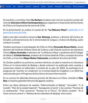 本次分享會在臉書(Facebook)等當地平臺進行直播,智利知名媒體“合作社”全程直播和深入報道。為擴大作品影響,小說西文版還在《智利文學網》上進行了全文刊發,為中國當代文學新作快速走進智利及拉美讀者群體打開了新的路徑。