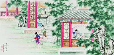 寶玉順腳一徑來到瀟湘館,信步走入,只見鳳尾森森,龍吟細細,悄無人聲。走至窗前,一縷幽香從碧紗窗中暗暗透出。寶玉便將臉貼在紗窗上,往里看時,耳內忽聽得細細的長嘆了一聲道:“每日家情思睡昏昏?!弊T鳳嬛繪