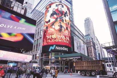 美國紐約時代廣場的納斯達克巨幅屏幕展示木蘭專屬宣傳片。(受訪者供圖)