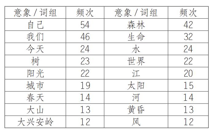 通過對詩集意象進行梳理(見圖1),筆者發現“森林”在《極地漫步》中出現42次?!吧帧碧刂浮按笈d安嶺”,“大興安嶺”則在詩集中出現12次。詩人魯微在與“森林”對話時,將“森林”賦予詩性、神性意味?!吧帧?,不是人類索取資源等物質財富的寶庫,而是植物動物等生命安居的家園,代表著詩人的某種信仰。它超越了沉重的感情,超越了烏托邦意識。這種對“森林”的情感化為彌漫在詩歌中的“森林意識”。在詩人魯微的筆下,“森林”的背后不單單是構成森林的生物,它不單是題材和背景,還形成了魯微獨特的創作個性。