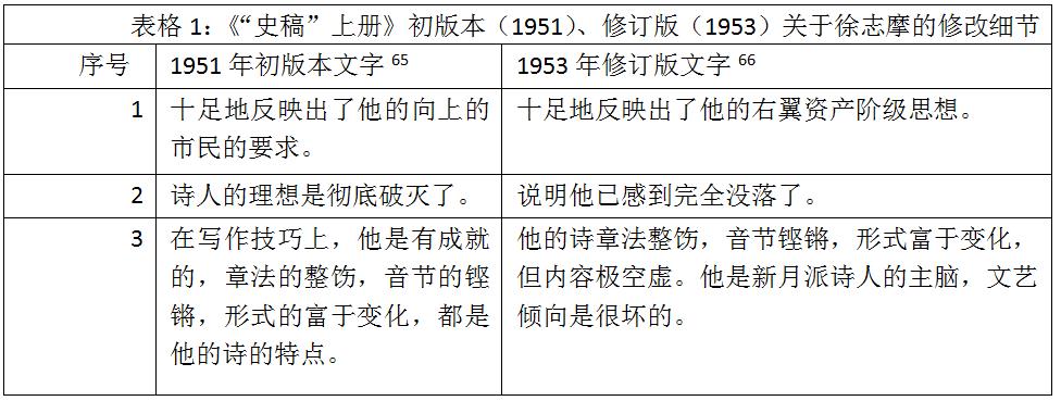 表面上看,王瑤并沒有真正做到傷筋動骨地對有關“新月派”前期文字加以處理,特別是對聞一多、朱湘、饒孟侃,但對盟主徐志摩的文字,的確進行了“有限度”的處理,列表中從“向上的市民的要求”轉變為“右翼資產階級思想”的文字陳述,這從政治性質上對徐志摩進行了否定,從中可看出王瑤在思想主導上從初稿的“統一戰線”思維轉變為“階級斗爭”思維67。而“沒落”一詞來描述徐志摩的走向,標志著撰者對這位代表性詩人的詩歌理想的徹底否定。具體在藝術成就的評價上,初版本立足于徐志摩詩歌的藝術成就,指出他在寫作技巧上是“有成就的”,作出肯定性評價,帶有推崇的意味,但修訂版中增加的文字,首先從內容上否定徐志摩的詩歌,認為其內容“極空虛”,其次還以“他是新月派詩人的主腦,文藝傾向是很壞的”加以否定。