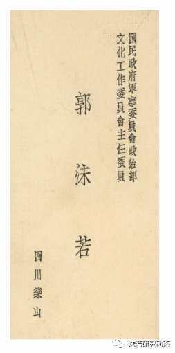 郭沫若紀念館藏有一張郭沫若的名片,豎行繁體字:右上臺頭兩行作“國民政府軍事委員會政治部文化工作委員會主任委員”,中間為姓名,清楚地印著“郭沬若”,左下角文字為“四川樂山”(見圖片)。