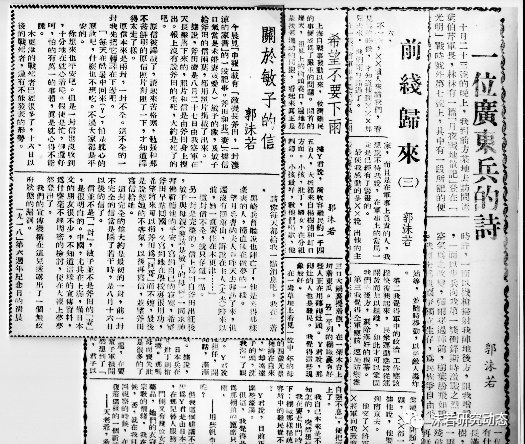之所以出現這種情況,我想無非兩個原因:一是排字時誤植,一是“沫”“沬”兩字通用。誤植的情況肯定會有(如前所說因鉛字排版的方式),但不會成為數量很多的現象。那應該就是兩字通用的原因,但可以證實嗎?郭沫若雖然曾在《創造十年續篇》中稱“沫若”的含義實指沬水、若水,但古代另有一條位于河南的河流名沬水。大概郭沫若當時也不太有把握,所以“沬若”“沫若”的署名,一開始就都有使用。上世紀二三十年代有些文字的民間使用,包括約定俗成的用法,與今不盡相同,不過“沫”“沬”兩字的使用有無這種情況,我們今天無從知曉。