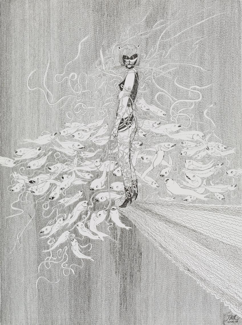 除了水墨,丁捷的線畫獨樹一幟,此作品《我們》曾參加日本福岡藝術雙年展。