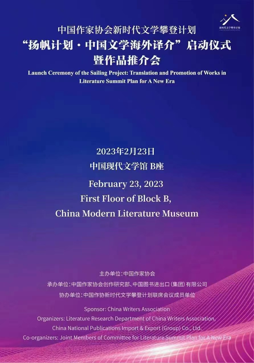 2023年2月23日下午,中國作家協會新時代文學攀登計劃“揚帆計劃·中國文學海外譯介”啟動儀式暨作品推介會在北京中國現代文學館舉行。中國作協主席鐵凝,中國作協黨組書記、副主席張宏森,阿爾及利亞駐華大使拉貝希,中國作協黨組成員、副主席李敬澤,中國出版集團有限公司董事、總經理、黨組副書記常勃,中國圖書進出口(集團)有限公司執行董事、黨委書記李紅文,中圖公司總經理林麗穎等,以及攀登計劃作家代表、中外出版機構代表、漢學家代表出席推介會。